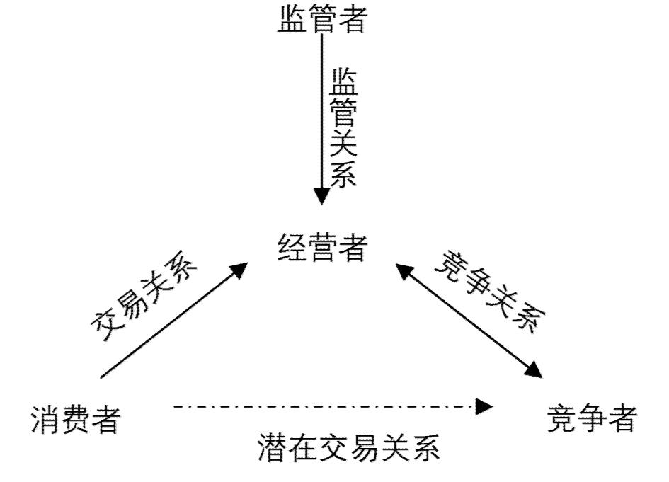 反不正当竞争法的目标在于保护企业自由竞争的同时保障消费者的自由选择决策不被干扰,以维护正当的市场经营秩序。市场交易是涉及经营者、消费者、监管者等多方主体间的复杂关系(如下图),其中以经营者为核心,其会与其他竞争者构成竞争关系,与消费者构成交易关系,在特定情况下与监管机构构成监管关系。但交易的过程绝非总是静态发生,事实上作为竞争者的其他经营者也可能会和消费者产生潜在的交易关系,经营者的行为可能随时影响消费者下一步的消费选择。真实的市场中包含有无数个上图所示的交易模式,这也就使得市场始终处在一种动态的竞争之中,“保护竞争者”模式的弊病在于仅仅关注了供给侧竞争者之间的损害,而忽视其与需求侧消费者间的联系。孤立地看待竞争行为,往往非但不能规范市场秩序,反倒可能损害现有竞争规则。正如德国最高法院在“电梯精灵”案中所说,竞争必然会对其他经营者产生损害,但要禁止某竞争行为,必须充分考虑经营者、消费者及公共利益。因此,反不正当竞争法目的应在于“保护竞争”,其效果在于激发以经营者为中心,消费者、监管者、社会公共利益为辅助的市场竞争活力,在维持各方利益最大化的基础上维持市场正常竞争秩序,降低市场内部风险。
