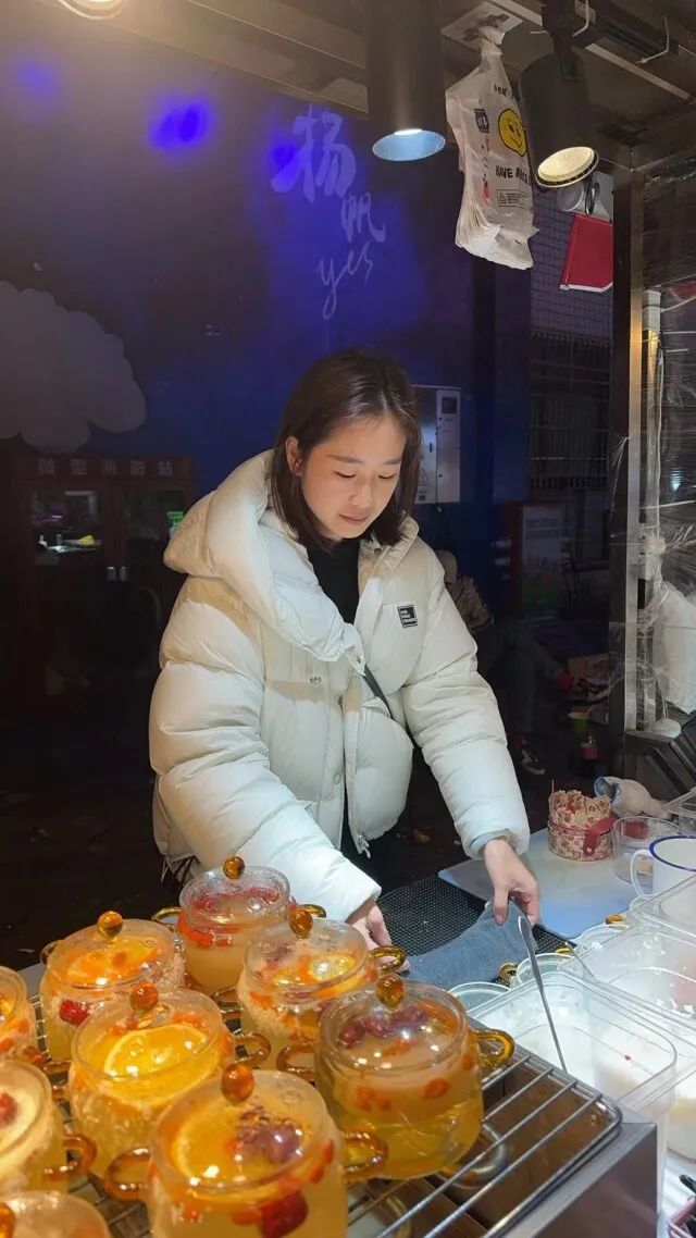 “来杯鲜热橙”的灯牌泛着暖黄色的光,跳动的炉火正热着一壶壶橙子米酒。9.9元一杯,每日现炖,价格亲民、新鲜卫生的热饮在冬日颇受欢迎,不时有人询价购买。