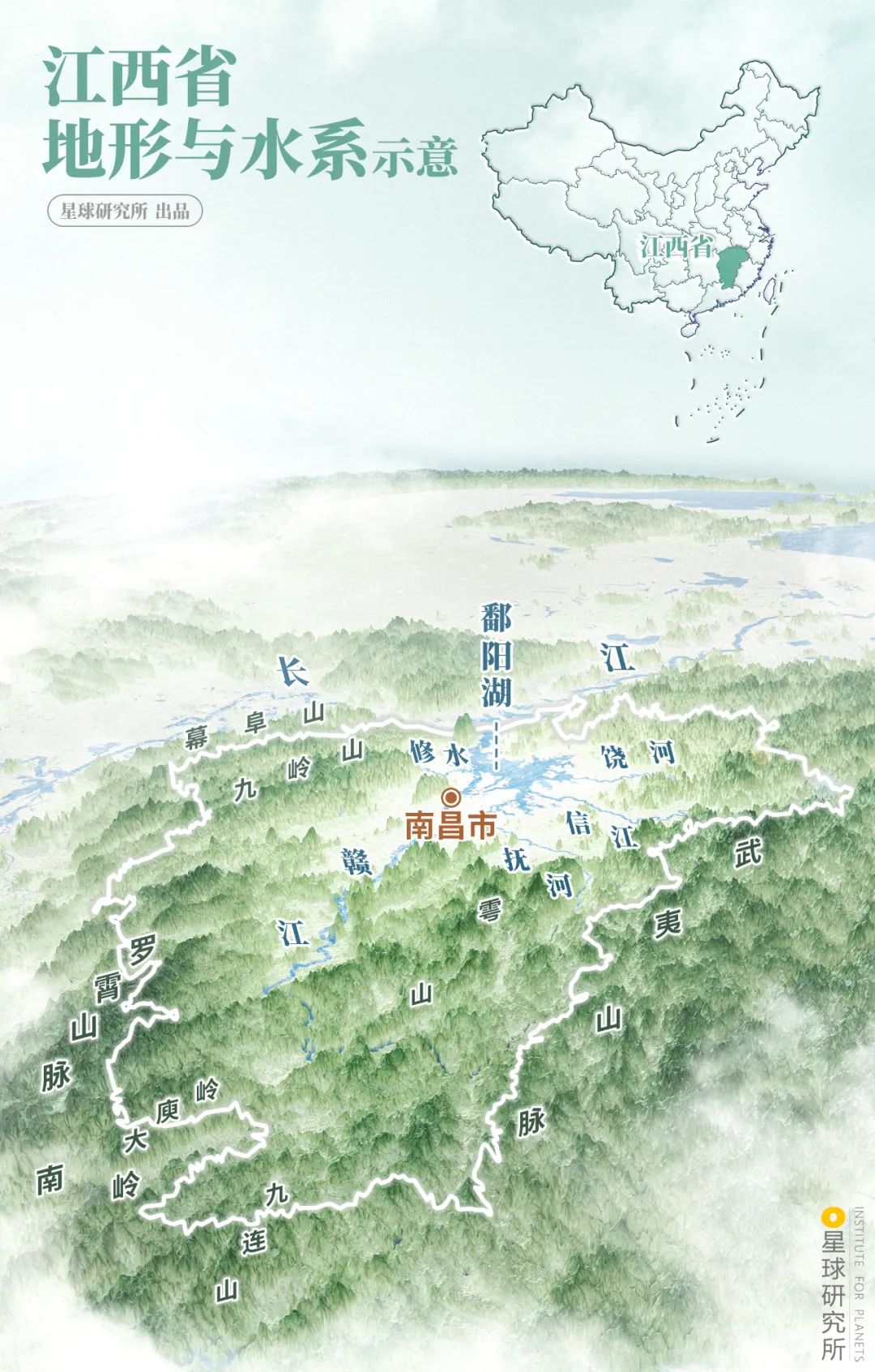 (江西省地形与水系示意,制图@俊/星球研究所)