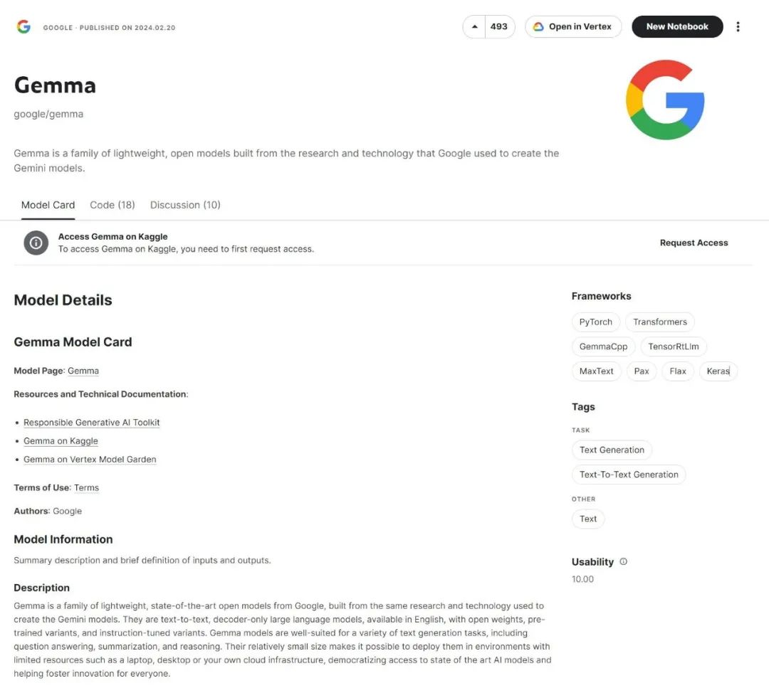 截至目前,开发者可以在Kaggle中免费使用Gemma,首次使用Google Cloud 的用户将获得 300美元的积分,并可申请高达50万美元的Google Cloud积分来使用这些模型。