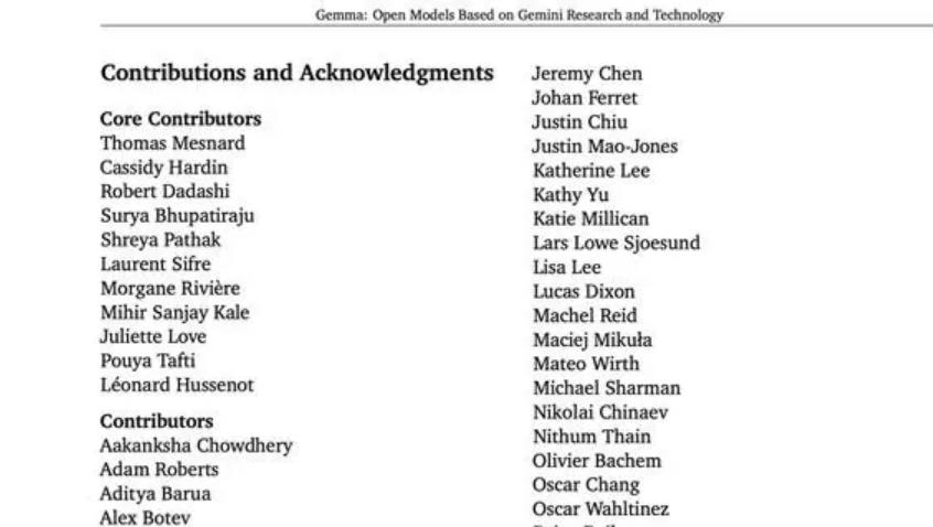 此外,根据技术论文显示,此次参与谷歌Gemma开源模型的研发人员数量高达57位。其中包括核心贡献者14人,参与者35人,产品管理2人,项目管理1人,执行赞助人5人。