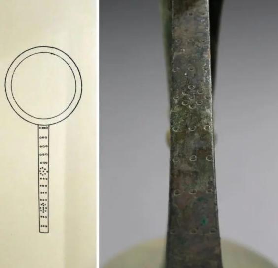 △ 熨斗示意图(左)。熨斗为勺状,熨斗的柄上面刻有表示12寸刻度的圆圈纹。3个圆圈表示1寸,9个圆圈呈菱形表示5寸,11个圆圈呈菱花形表示10寸