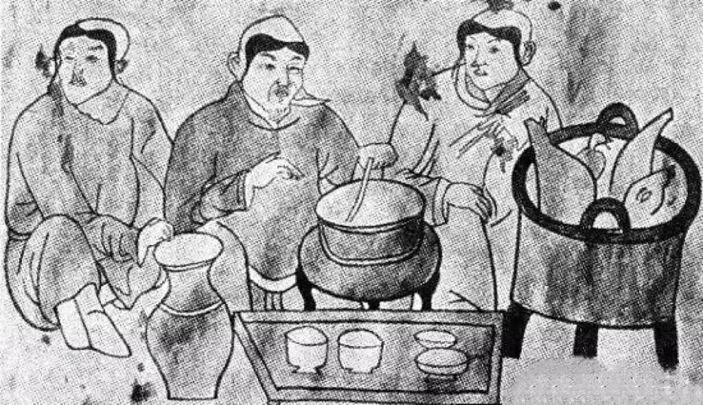 1984年,一组出土于内蒙古昭乌达盟敖汉旗的辽代早期壁画生动展示了一场千年前契丹人涮羊肉的场景。画面中,三位契丹人围坐在火锅周围,其中一人正用筷子在锅中涮羊肉。桌上摆放着羊肉和各种调味料,勾勒出一幅美味的画面。这是迄今为止我国最早的关于涮羊肉的图像资料。