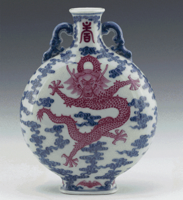 小口,短颈,双耳,扁圆腹,圈足。瓶身前后各以胭脂红彩绘一正面五爪龙,并以青花绘祥云环绕其间,青花深沉,胭脂红娇艳,两色相映成趣。扁瓶颈部以胭脂红彩书写异体“寿”字,寓意百寿吉祥。底部落青花六字篆书款“大清乾隆年制”。乾隆一朝多有对历代名瓷的临摹与仿烧,此类扁瓶应是借鉴明代永乐、宣德时期的抱月瓶而来。有研究者认为《各作成做活计清档》中所记载的“宝月瓶”“马褂瓶”即是此类器物。胭脂红为釉上彩,于雍正十三年在景德镇御窑厂烧制成功,管理御窑厂的督陶官唐英(1682—1756)在《陶成八年二月二十日《请定次色瓷器变价之例以杜民窑冒滥折》中提到希望将“选落之黄器、五爪龙等件,仍附运进京,以尊体制而防亵越。”但是乾隆所作的朱批中明确表示:“黄器如所请行。五爪龙者,外边常有,仍照原议行。”这里的“仍照原议行”就是在当地变价出售。