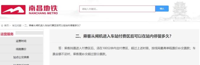 根据南昌地铁网站公告,乘客持票进入付费区后,须在180分钟内出付费区,超过上述时限,按线网最高单程票价补交票款;车票金额不足时,乘客须补交超过部分票款。