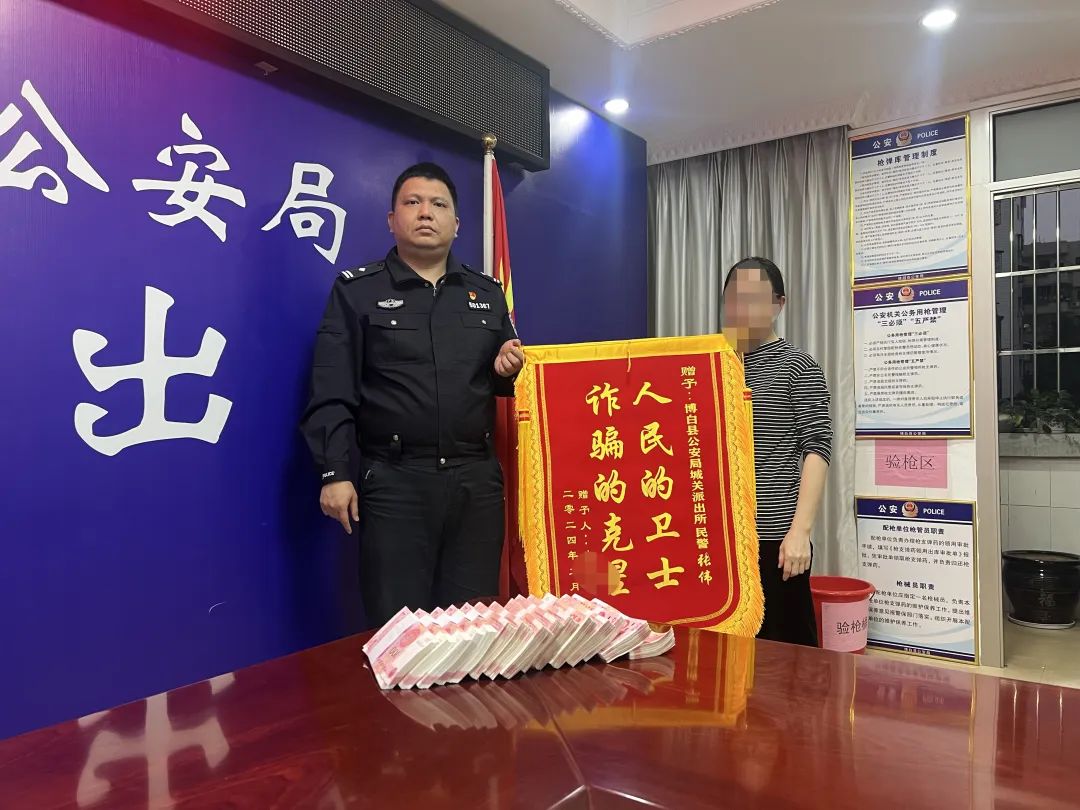 黄女士将锦旗送到博白县公安局城关派出所。去年,黄女士通过抖音认识了一名网友。在跟网友聊天时,网友告诉她,他有同学在深圳证券交易所上班,可以通过同学的内幕消息投资证券赚钱,问她有没有兴趣投资。他开始画大饼,说得天花乱坠。禁不住网友的三寸不烂之舌,黄女士就相信了他。经过网友多次游说,她陆续开始投资一个叫“国际原油”的App,每次投资都是1万元。在她将80多万元投资进去后,发现联系不上他了,并且App里的钱也提现不出来,此时她怀疑很可能是被骗了,她来到城关派出所报案。