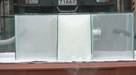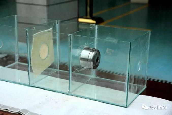 实验准备:消防员准备了一个三格的玻璃罩,中间将点燃烟饼生烟,在俩个隔板上开了洞口安装想要模拟的逃生面罩过滤盒(有3C认证标识的消防逃生面罩)、毛巾等待测试品,俩头也开了孔洞插入同款微型吸尘器模拟人体主动吸气。