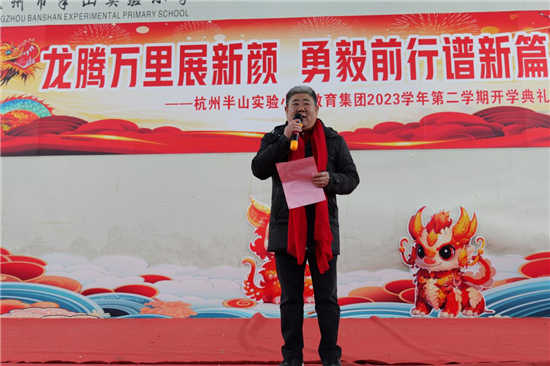 在杭州半山实验小学教育集团开学典礼上,校长、书记袁红强致辞。他提到,许多同学寒假里看了电影《热辣滚烫》,还有《飞驰人生》,可能到现在还沉浸在心潮澎湃之中。袁红强告诉同学们,人生没有那么多的飞驰、也没有那么多的滚烫,作为普通的我们,做最好的自己才是人生的真谛。他送给同学们一句话,那就是:做“四新”少年,书平凡人生!
