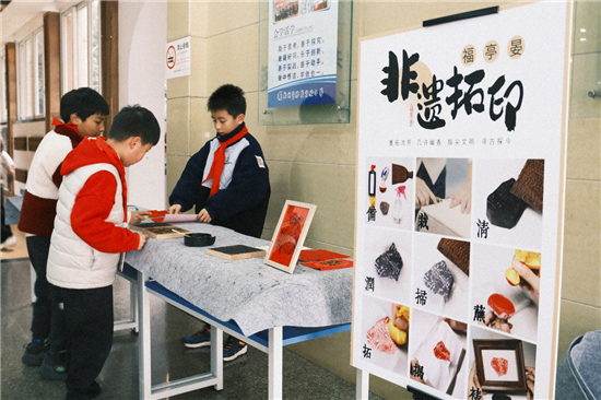 活动现场最热闹的要数“非遗拓印”的社团活动了!同学们认真地将模板涂抹墨汁,按压均匀,用木板在红纸上拓印福字。寓意着新学期福气满满、福满校园。