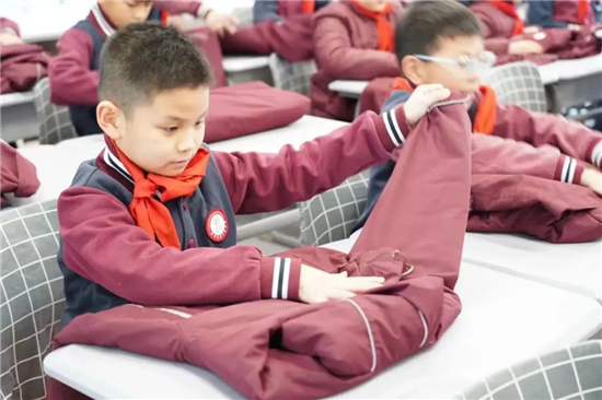 同学们还分年级举行了劳动比赛:一年级系鞋带,二年级挂红领巾,三年级叠衣服,四年级缝扣子,五年级系中国结,六年级美食大赛。