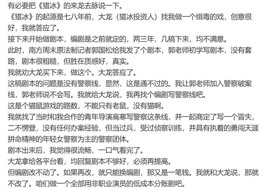 何况《猎冰》剧本数易其稿,为了节省成本选取了没有表演经验的素人演员承担与反派势力对抗的重要剧作任务,几乎是双重冒险。
