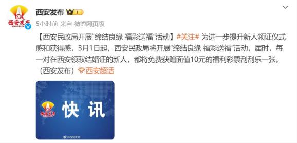 2月27日,据西安发布消息,为进一步提升新人领证仪式感和获得感,3月1日起,西安民政局将开展“缔结良缘,福彩送福”活动。届时,每一对在西安领取结婚证的新人,都将免费获赠面值10元的福利彩票刮刮乐一张。