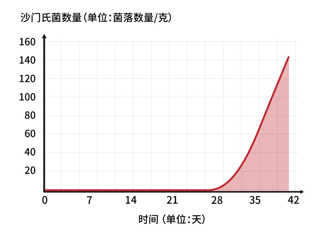有实验显示[1],取当日的新鲜鸡蛋在 4℃ 的冷藏条件下存放,一个月之后,细菌数量呈指数型增加。到 35 天时,鸡蛋蛋黄中沙门氏菌的数量涨到 28 天的 53.37 倍。