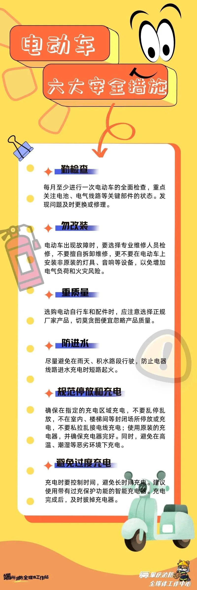时刻关注电动车的安全问题,养成良好的安全习惯。不要随意拆卸、改装电动车的部件,避免增加火灾风险。