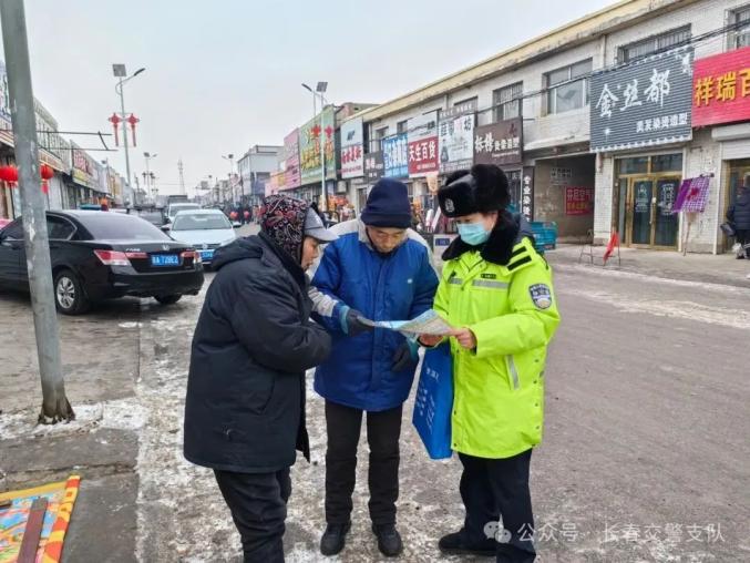 长春市公安局交警支队组织警力走进德惠市大青咀集市,开展 “一老一小”交通安全宣传活动,扎实筑牢农村交通安全防线。民警重点对“一老一小”群体讲解交通法规和安全常识,普及酒驾醉驾、无牌无证、面包车超员、农用车违法载人等交通违法行为的危害性。他们还重点讲解农村交通安全出行注意事项,倡导大家要严格遵守道路交通法律法规,自觉养成文明参与交通的良好习惯。