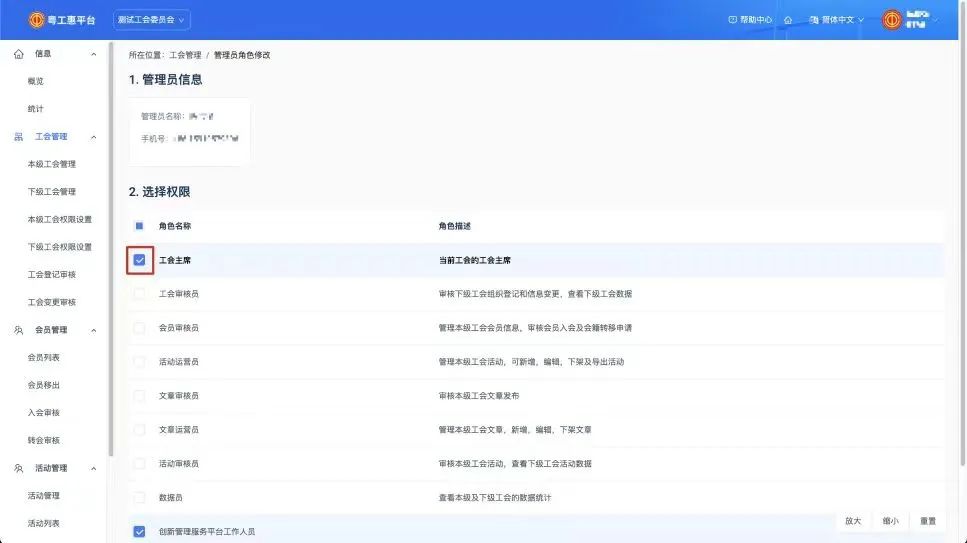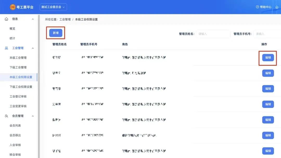 该步骤需要对应工会的管理员登录粤工惠平台进行设置,申请人本人不可设置自己的角色权限。