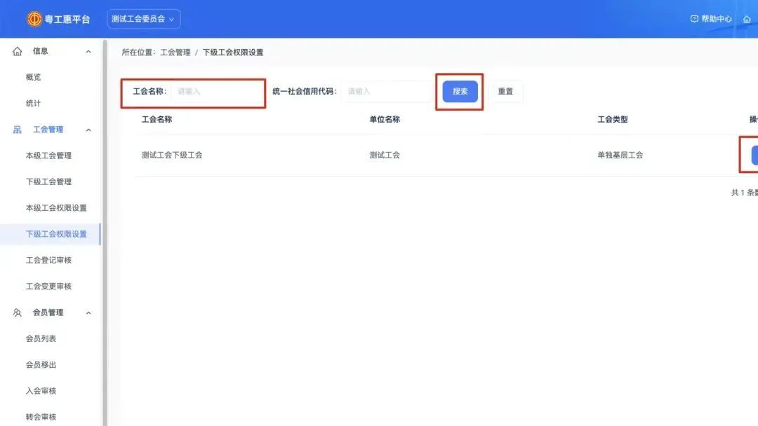 (3)输入所要设置的下级工会名称,点击「搜索」,根据搜索结果,点击要设置的工会对应的「权限设置」按钮;