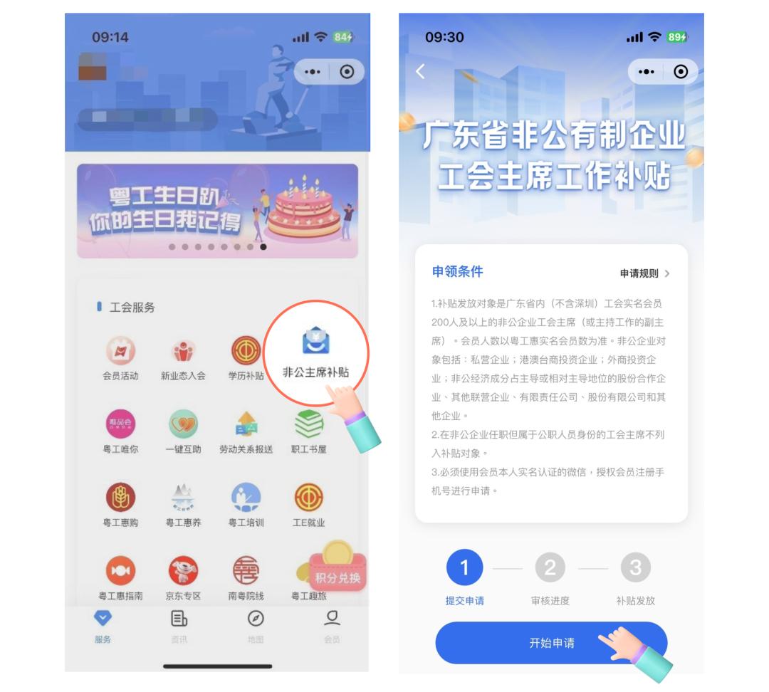 根据《广东省非公有制企业工会主席工作补贴发放管理办法》,申报时需要根据企业工会实际情况填写内容。非公企业工会主席实名登录粤工惠APP或,点击进入「非公主席补贴」服务,按页面提示填写申请资料,上传成立或换届的批复文件、本季度工作总结等相关资料。