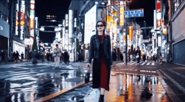 比如,输入一个女子走在夜晚繁华的都市,很可能出来的视频是这样。
