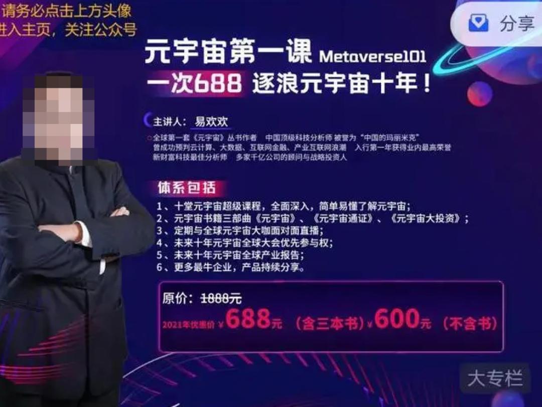 一个名为《元宇宙第一课》的课程,尽管课程内容只是一些基础的行业报告、行业书籍,就敢定价688元。上线仅10天,累计收入近160万。