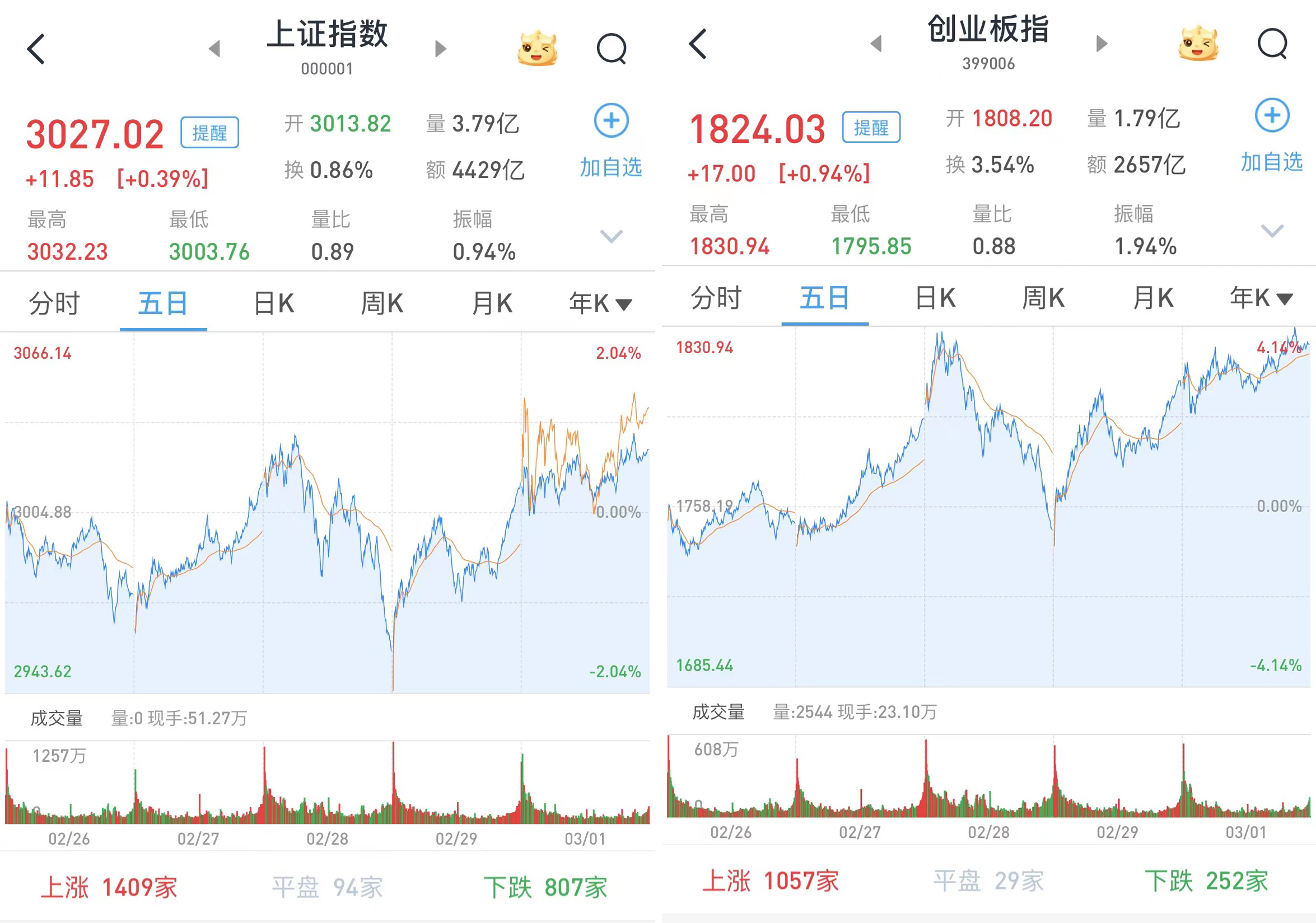 至3月1日收盘,上证综指涨0.39%,报3027.02点;科创50指数涨0.96%,报815.49点;深证成指涨1.12%,报9434.75点;创业板指涨0.94%,报1824.03点。