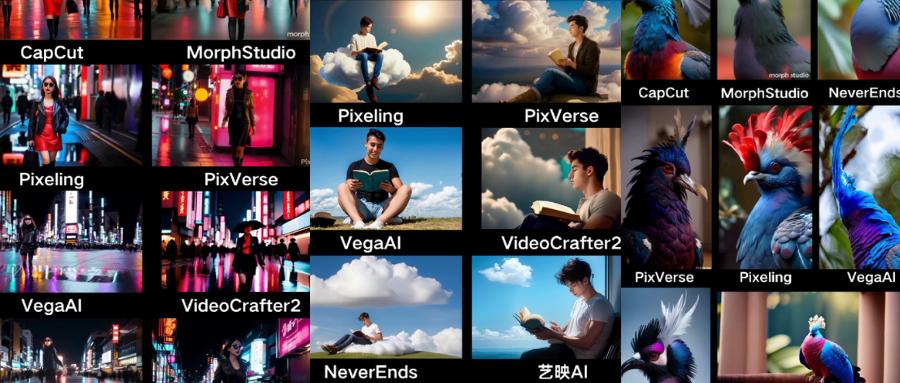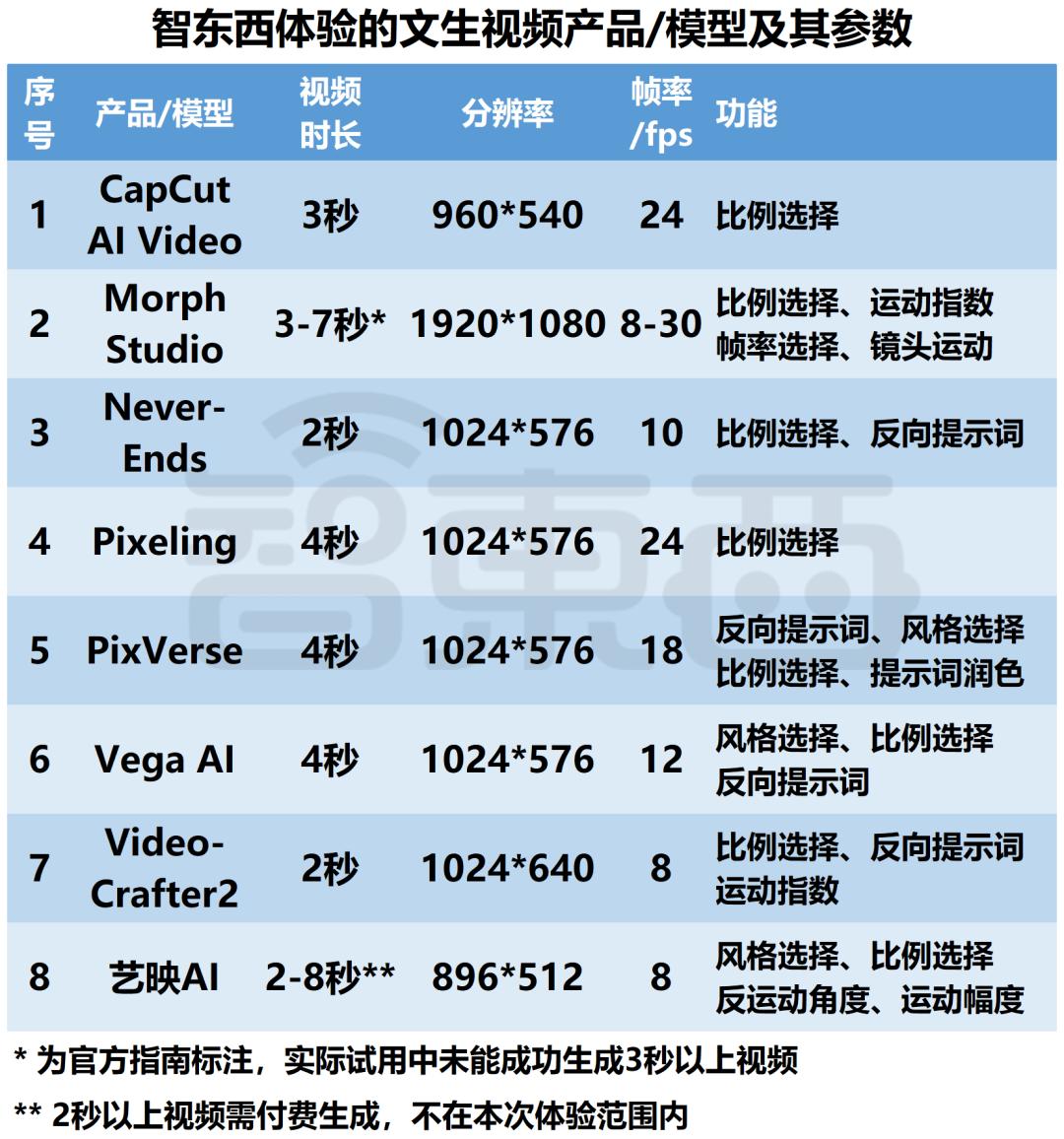 综合产品易得性、视频生成速度等因素,智东西本次选取字节的CapCut AI Video、腾讯的VideoCrafter2、右脑科技的Vega AI、爱诗科技的PixVerse、MewXAI的艺映AI、智象未来的Pixeling,以及NeverEnds和Morph Studio的同名产品8款工具进行对比,并从个人体验的角度,尝试从语义理解、运动平滑度、运动程度以及成像质量方面打分。
