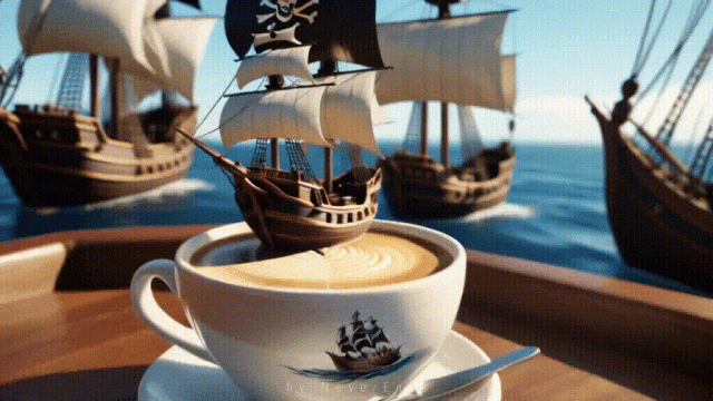 NeverEnds、艺映AI也将船放进了咖啡杯,同时在背景绘制了大海和更多海盗船。NeverEnds还给咖啡加了拉花。