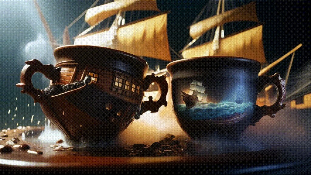 PixVerse分别生成了咖啡杯、海盗船,但稳定性较差,前景中的咖啡杯最后变形成了一艘船。
