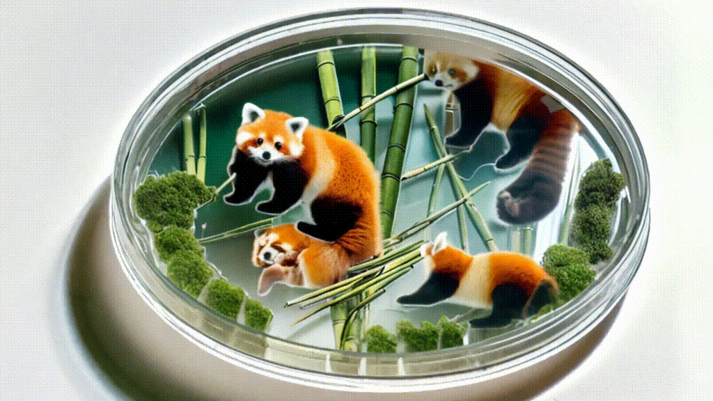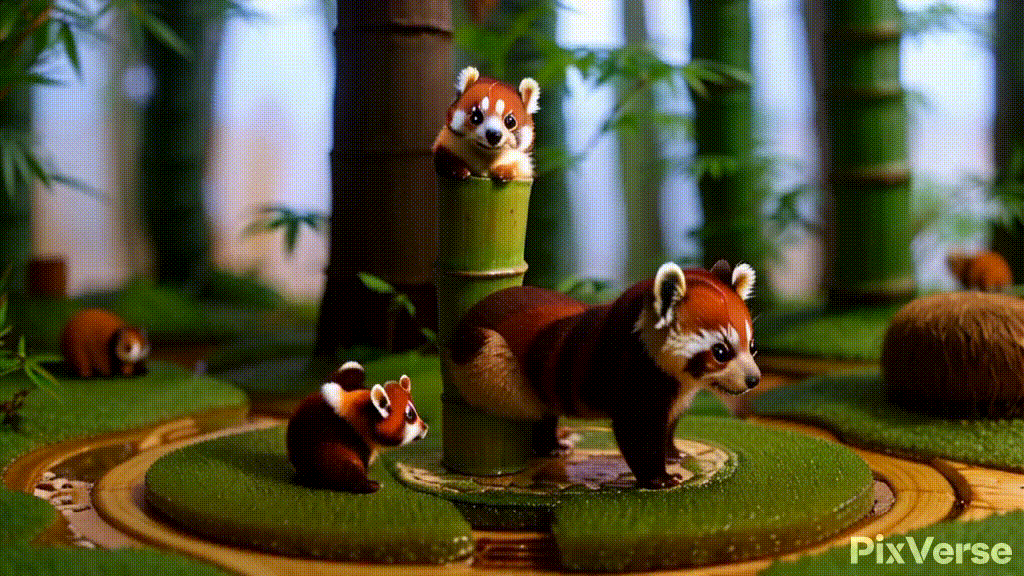 提示词6:一个培养皿,里面长着一片竹林,里面有小熊猫在跑来跑去。