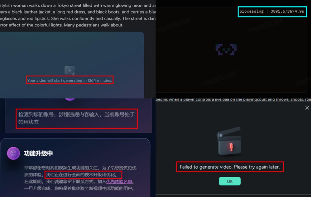 在智东西体验这些产品或模型的过程中,遇到了不少令人“头秃”的突发情况。如字节的CapCut AI Video、阿里的ModelScope T2V等待时间过长,生数科技的PixWeaver、万兴科技的Filmora频频出现Bug等,各种各样的不确定因素成为体验路上的拦路虎。