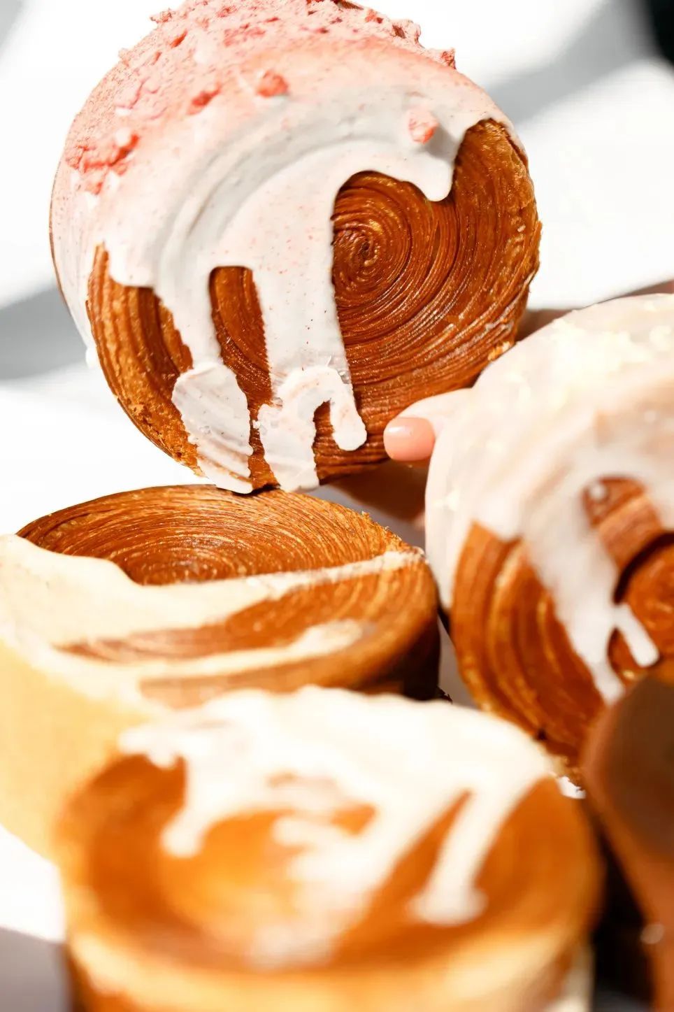 让纽约人排队40分钟、超像唱片圆形可颂,是酥皮爱好者的福音。上海第1家卖的店开在西岸,鸿寿坊店去年刚开,至今依旧是普陀咖啡厅热榜第1。开心果抹茶、肉桂、明太子、黑巧……超多口味,每只顶上都有独一无二的貌美topping,流心爆浆、香酥掉渣,一扯满是黄油香气。