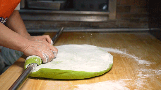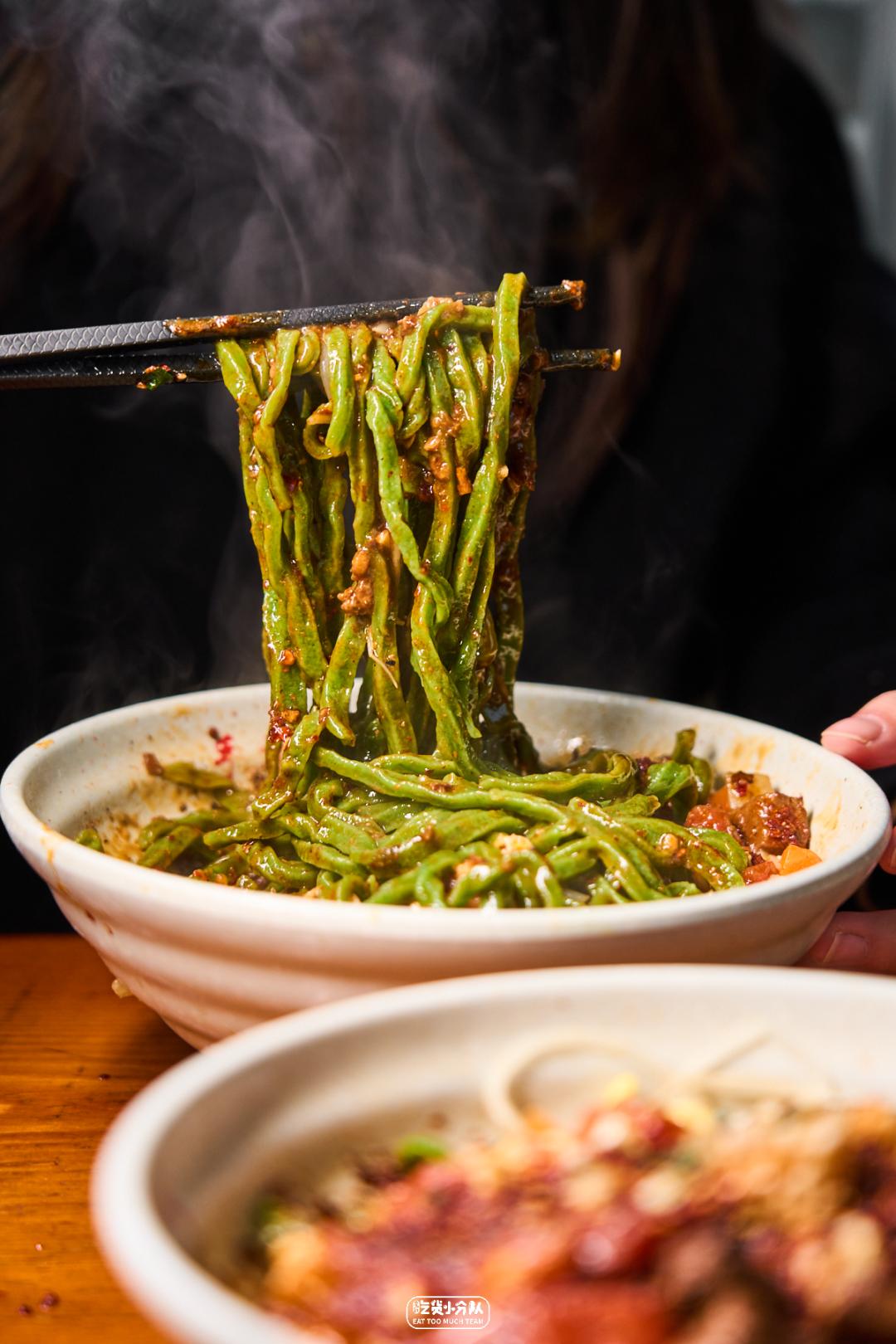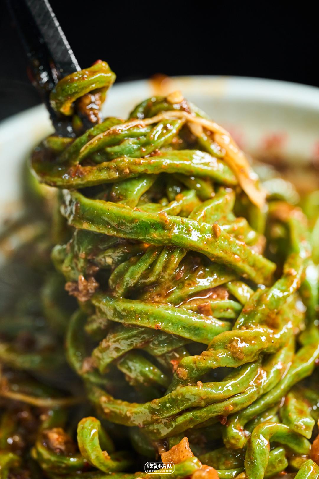 一位西安大爷经营的菠菜面馆,在上海的陕西圈子里老有名气,最近大爷因年事已高回老家休养了,店铺交给了陕西老乡打理,口味依旧。好的菠菜面一定要纯手工,把7斤的面团反复擀成直径1.5m的大饼,再垒起来切条。口感劲道、麦香十足,上桌前淋1勺灵魂油泼辣子,香迷糊了~