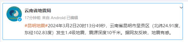 来源 云南省地震局微博、网友评论原标题:《刚刚,昆明地震了!》