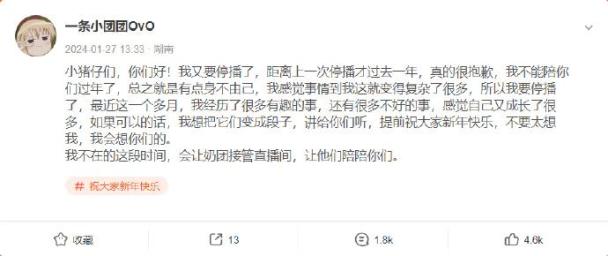 1月27日,小团团曾在斗鱼鱼吧发动态宣布停播,截至目前已停播35天,而她的微博更新停留在2023年12月2日。有传言称小团团已被逮捕。