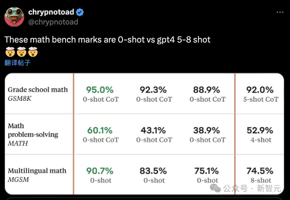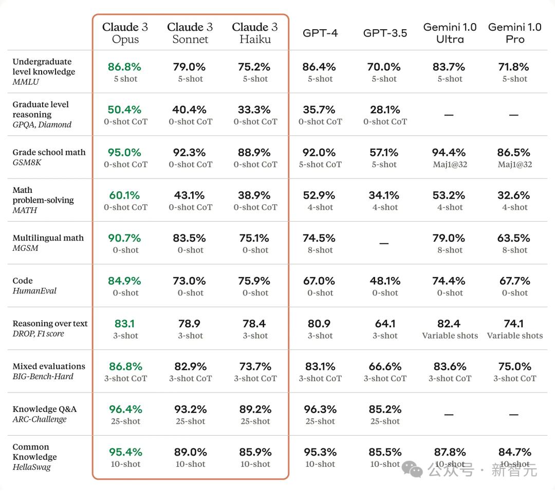 这些数学基准还是0样本的Claude 3,击败了训练了5-8个样本的GPT-4。