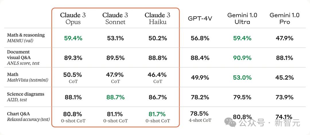 从下面基准测试中,可以看出,Claude 3系列模型在部分视觉能力上,性能刷新SOTA。