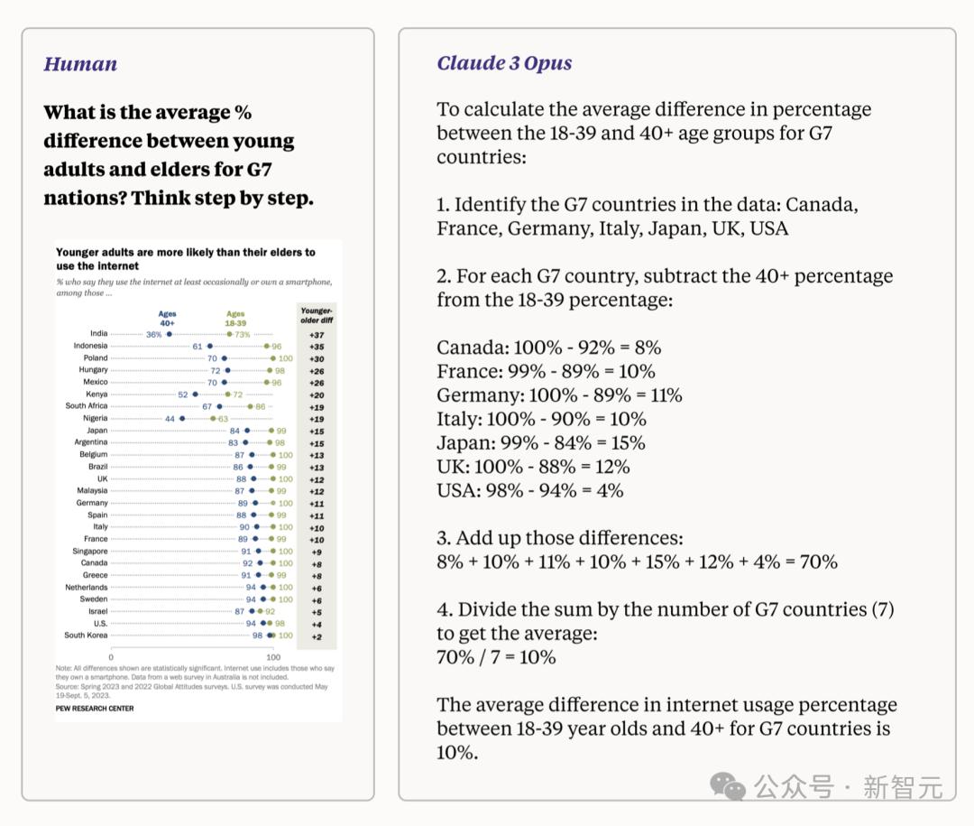 输入一张来自皮尤研究中心图表「年轻人比长辈更有可能使用互联网」,然后询问「G7国家的年轻人和老年人之间的平均差异百分比是多少?请一步步思考」。