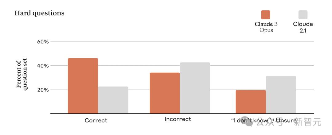 跟Claude 2.1相比,Opus在复杂的开放性问题上,准确度直接翻倍提升,错误答案大大减少。