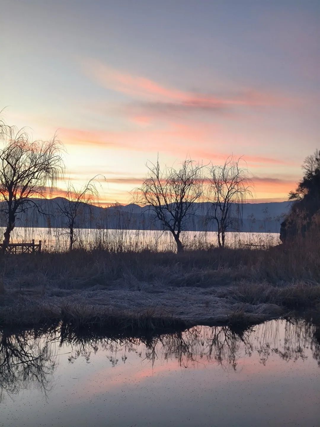 把自拍杆和手机留在栈道拍延时,我送云朵回家,妈妈起来了,她在准备早餐,我折回湖边栈道拿手机。此时太阳已经出来,阳光的金与雪的银在同样的光里融合了。树枝枝上,芦苇上,草尖尖上,积雪不时坠落,柳树上的雪被融成了水、滴落成一道清澈的光,听雪落、水滴的声音,走在日光里,身边是自己的影子,真舍不得回。