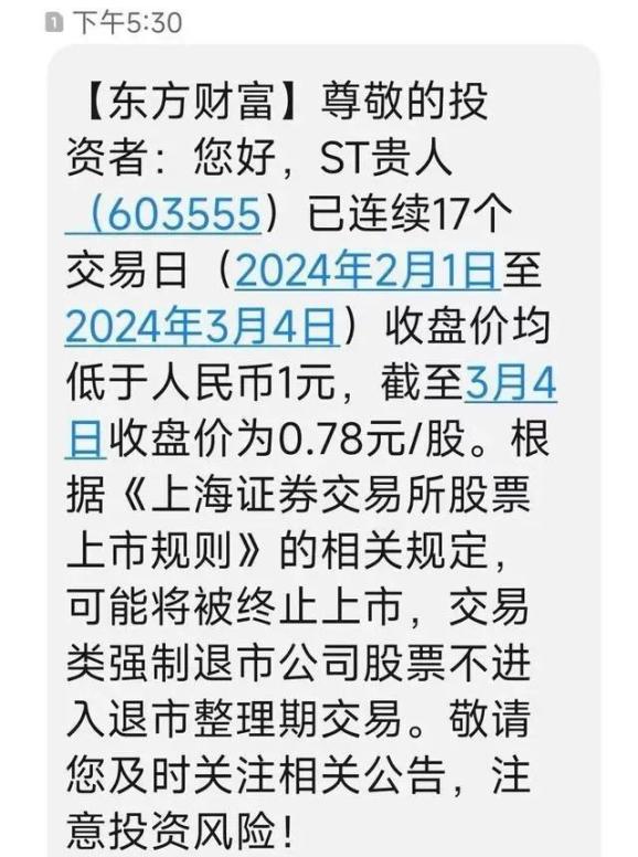 投资者收到风险提示短信(图据齐鲁晚报)多重利空之下,ST贵人股价自2月1日起低于1元,中途虽一度反弹至0.97元/股,但仍无力回天,截至3月4日收盘,其股价连续17个交易日低于1元,这也就意味着,即便未来3天全部涨停,股价也无法回到1元以上。根据退市新规,如果公司股票连续20个交易日的每日股票收盘价均低于1元,公司股票可能被上交所终止上市交易,且不进入退市整理期。因此,ST贵人触及交易类强制退市几成定局。
