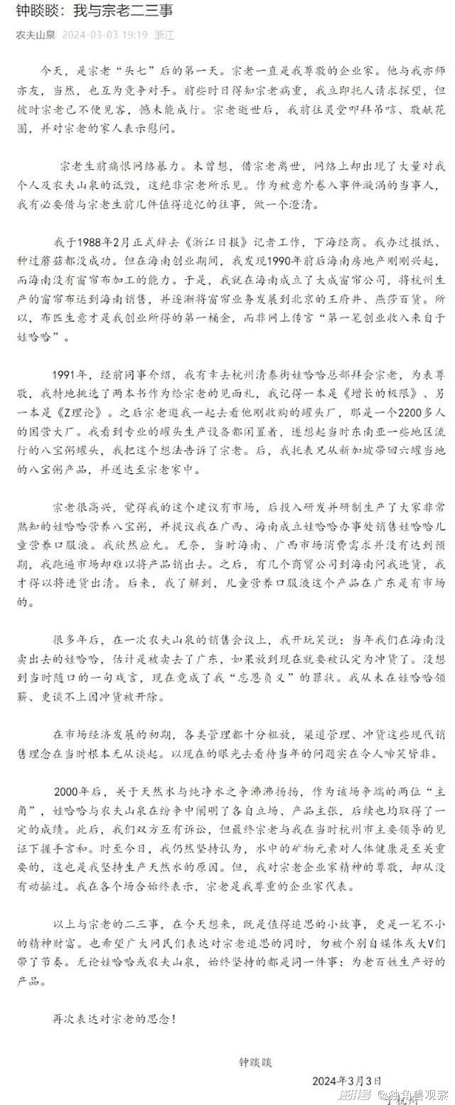 这个一向低调的首富,在3月3日晚间,罕见地通过农夫山泉公众号发布了《钟睒睒:我与宗老二三事》。