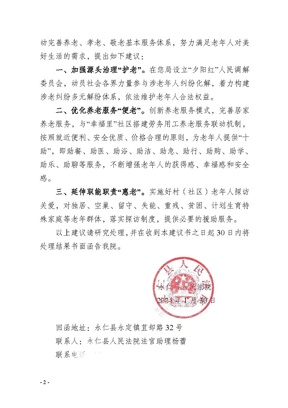 贯彻落实最高人民法院《关于为实施积极应对人口老龄化国家战略提供司法服务和保障的意见》,将维护老年人权益作为审判执行工作中的一项重要内容,结合赡养纠纷案件审判工作中发现的问题,充分运用司法建议为社会综合治理“把脉开方”。向永仁县民政局发出《永法建【2024】1号司法建议书》,其中建议民政局创新养老服务模式,完善居家养老服务,与“幸福里”社区搭建劳务用工养老服务联动机制,按照就近便利、安全优质、价格合理的原则,为老年人提供“十助”,即助餐、助医、助浴、助洁、助急、助行、助购、助学、助乐、助聊等服务。