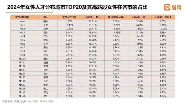深圳年薪20万元以上女性人才占比超四成日前,猎聘大数据研究院推出《2024女性人才数据洞察报告》。报告显示,深圳年薪20万元以上的女性占比为41.88%,广州为30.79%。