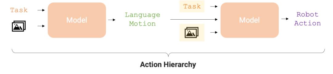 RT-H 的模型架构借鉴了 RT-2,后者是一个在互联网规模的视觉与语言数据上共同训练的大型视觉语言模型(VLM),旨在提升策略学习效果。RT-H 采用单一模型同时处理语言动作和行动查询,充分利用广泛的互联网规模知识,为行动层级的各个层次提供支持。