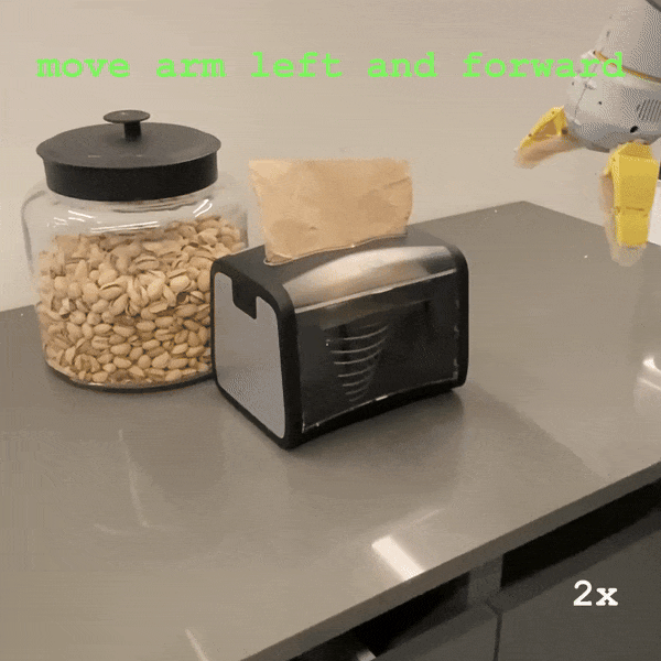 语言动作不是简单的固定原语,而是根据当前任务和场景的具体情况通过指令和视觉观察来学习的。比如,「手臂向前伸」并没具体说明移动的速度或方向,这取决于具体任务和观察情况。学习到的语言动作的上下文依赖性和灵活性为我们提供了新的能力:当策略未能百分百成功时,允许人们对语言动作进行修正(见图 1 中橙色区域)。进一步地,机器人甚至可以从这些人类的修正中学习。例如,在执行「拿起可乐罐」的任务时,如果机器人提前关闭了夹爪,我们可以指导它「保持手臂前伸的姿势更久一些」,这种在特定场景下的微调不仅易于人类指导,也更易于机器人学习。