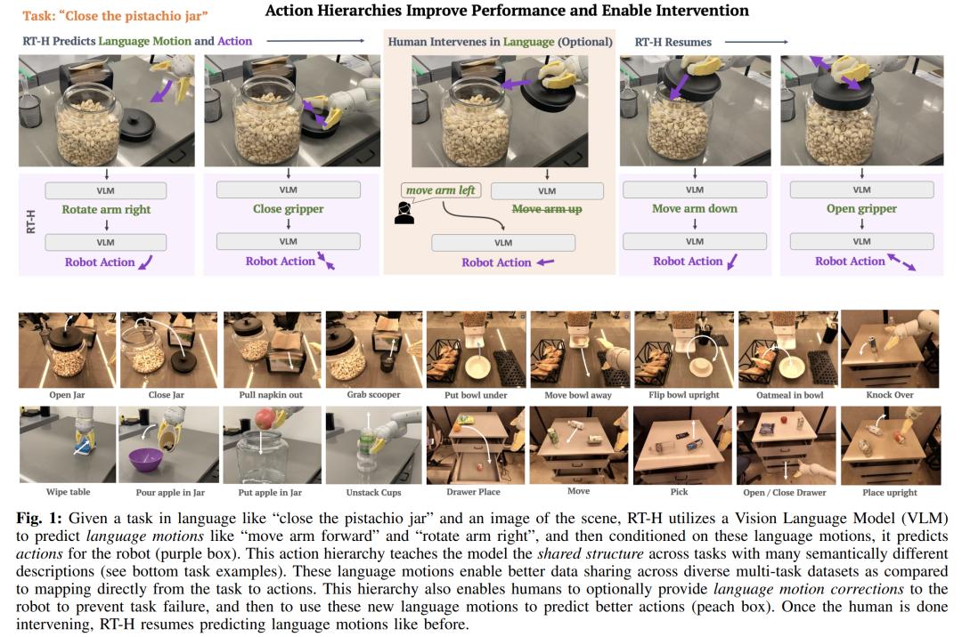 谷歌 DeepMind 去年 7 月推出的 RT-2:全球第一个控制机器人的视觉 - 语言 - 动作(VLA)模型。只需要像对话一样下达命令,它就能在一堆图片中辨认出霉霉,并送给她一罐可乐。如今,这个机器人又进化了。最新版的 RT 机器人名叫「RT-H」,它能通过将复杂任务分解成简单的语言指令,再将这些指令转化为机器人行动,来提高任务执行的准确性和学习效率。举例来说,给定一项任务,如「盖上开心果罐的盖子」和场景图像,RT-H 会利用视觉语言模型(VLM)预测语言动作(motion),如「向前移动手臂」和「向右旋转手臂」,然后根据这些语言动作,预测机器人的行动(action)。