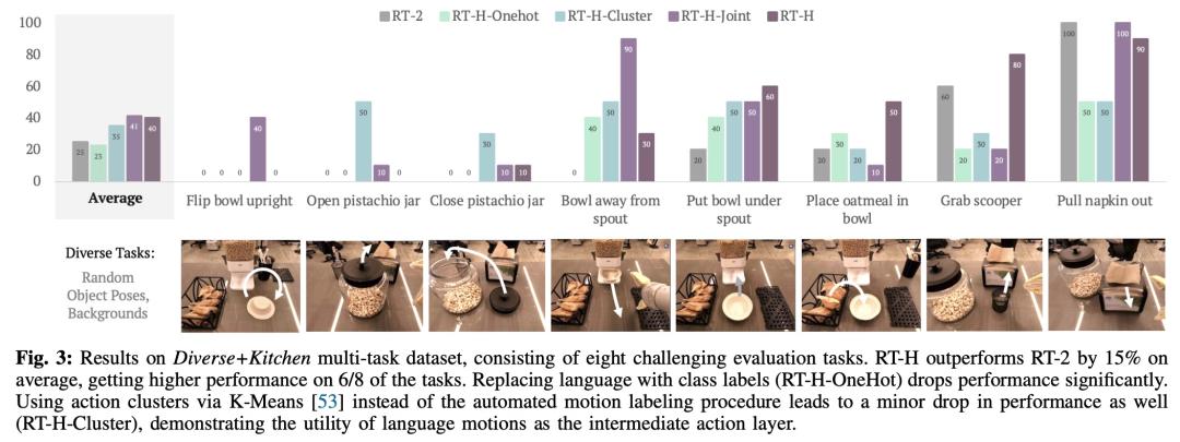 这个行动层级(action hierarchy)对于提高机器人完成任务的准确性和学习效率非常有帮助,使得 RT-H 在一系列机器人任务中的表现都优于 RT-2。