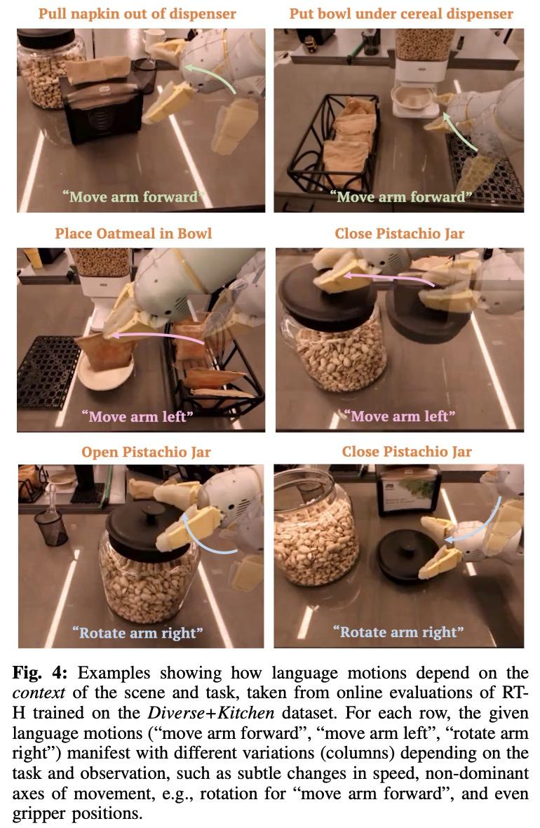 图 4 展示了几个从 RT-H 在线评估中获取的上下文动作示例。可以看到,相同的语言动作通常会导致完成任务的行动发生微妙的变化,同时仍尊重更高级别的语言动作。