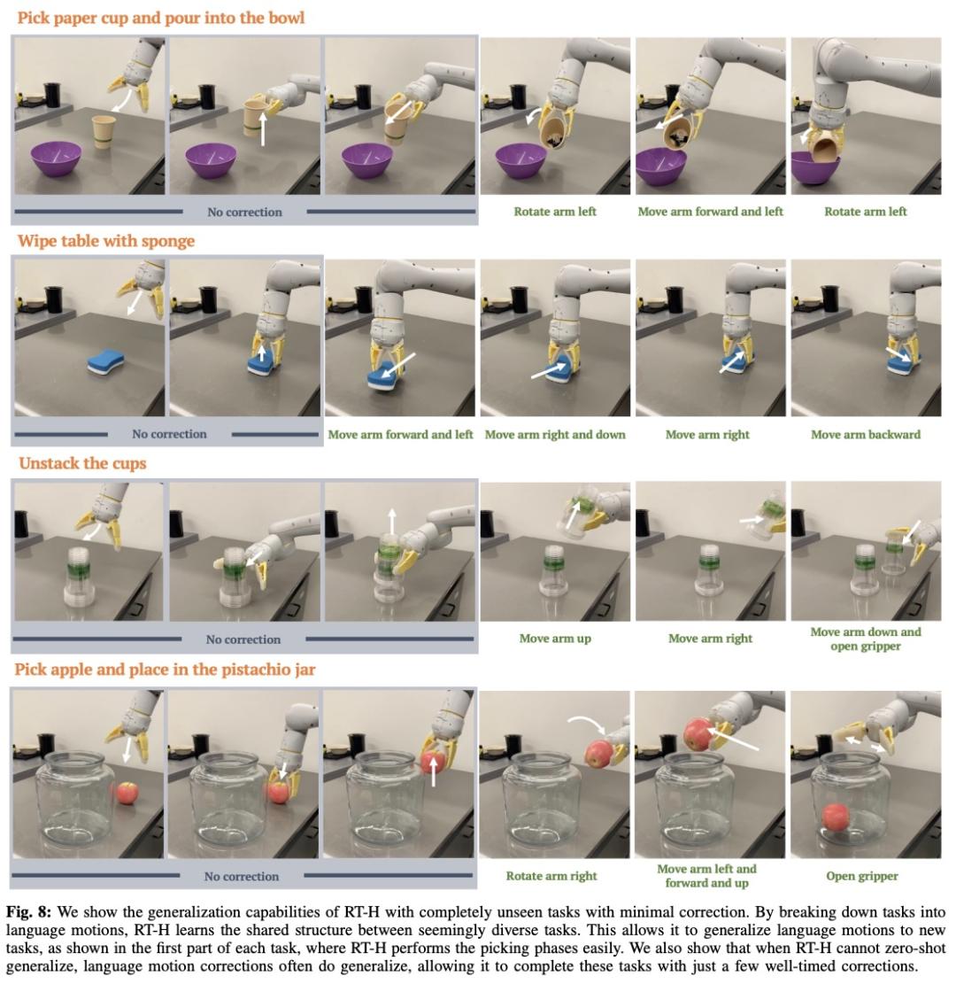 实际上,看似不同的任务之间具备一些共享结构,例如这些任务中每一个都需要一些拾取行为来开始任务,并且通过学习跨不同任务的语言动作的共享结构,RT-H 可以完成拾取阶段而无需任何修正。