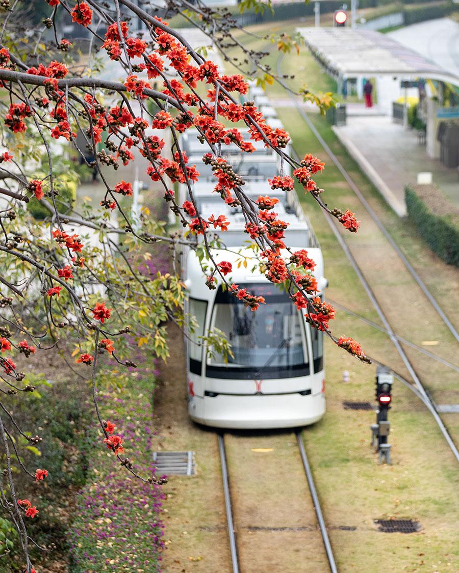 阅江西路的有轨电车在盛开的木棉花下穿行 袁彬/摄